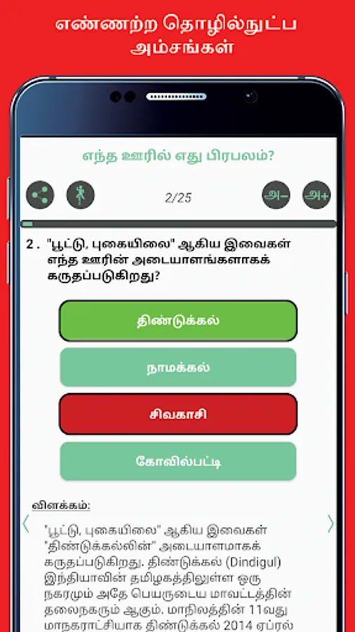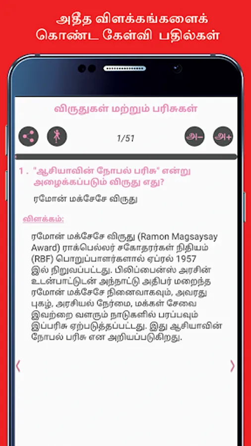 எழுத்துக்களை பெரிதாகவோ, சிறிதாகவோ மாற்றிக் கொண்டு அவரவர் பார்வைத் திறனுக்கு தகுந்தபடி படிக்கலாம். அதற்காக அ-, அ+ என்ற இரு வேறு தேர்வு முறை கொடுக்கப்பட்டு உள்ளது. இது தவிர உங்களுக்கு விருப்பமான கேள்விகளை நண்பர்களுடன் சமூக வலைத்தளங்களில் கூட பகிர்ந்து கொள்ளலாம். அத்துடன், மேலே உள்ள ஜம்ப் என்ற ஆப்ஷனை தேர்வு செய்து விரும்பிய கேள்விக்கான எண்ணை மட்டும் கொடுப்பதன் மூலம் குறிப்பிட்ட கேள்விகளுக்கு தாவிச் செல்லலாம்.