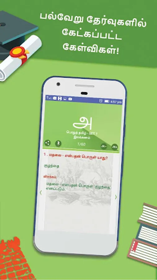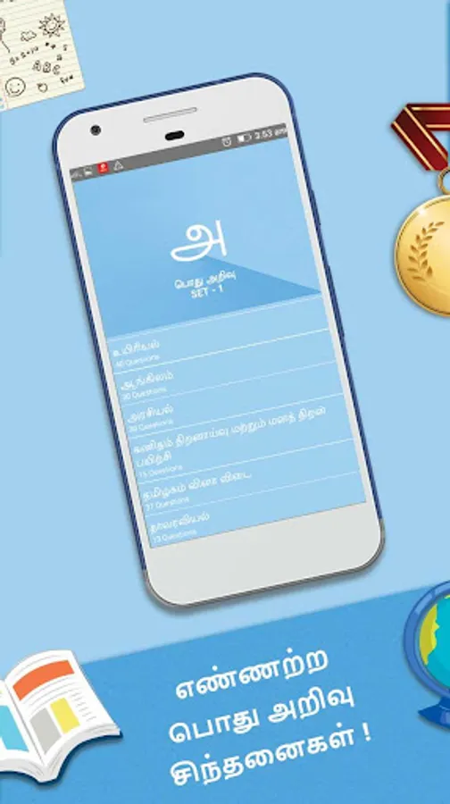 இந்த செயலியில் பொதுத் தமிழ், பொது அறிவு, பள்ளிப் பாட புத்தகங்கள், VAO அல்லது கிராம நிர்வாக அலுவலர் என மேற்கண்ட தலைப்புகளில் இருந்து 2000 க்கும் மேலான கேள்வி பதில்கள் அடங்கி உள்ளன.அதில் பல கேள்விகள் ஒவ்வொரு அரசுத் தேர்விலும் அடிக்கடி ஏதேனும் ஒரு விதத்தில் நேர்முகமாகவோ, மறைமுகமாகவோ கேட்கக் கூடியவை.