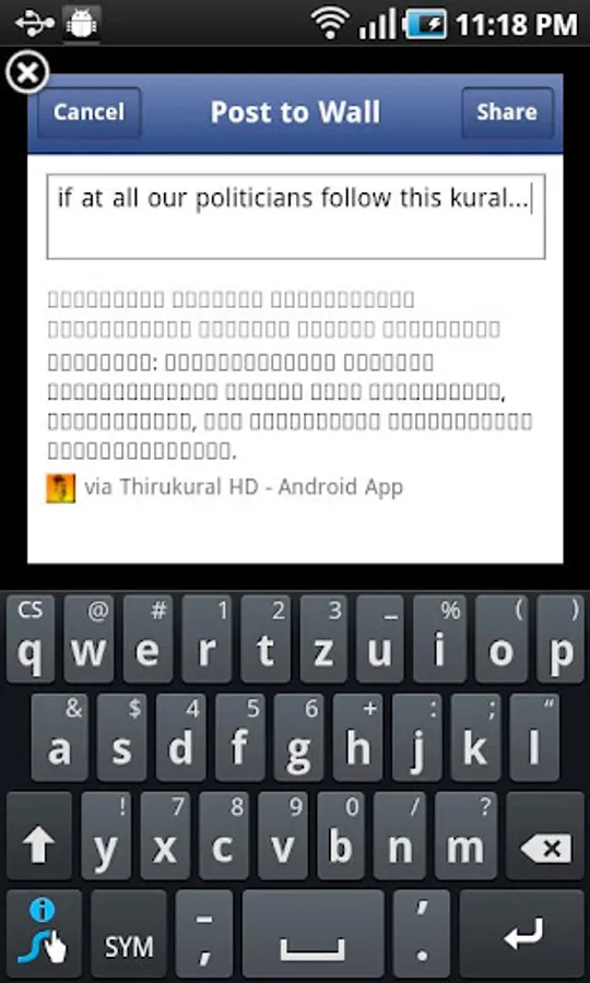 Facebook posting - You can post a kural on your facebook wall with your customized comments, where we think you will go creative with your friends