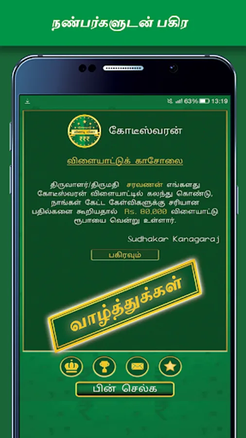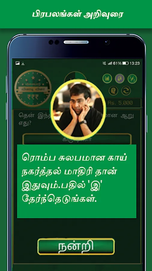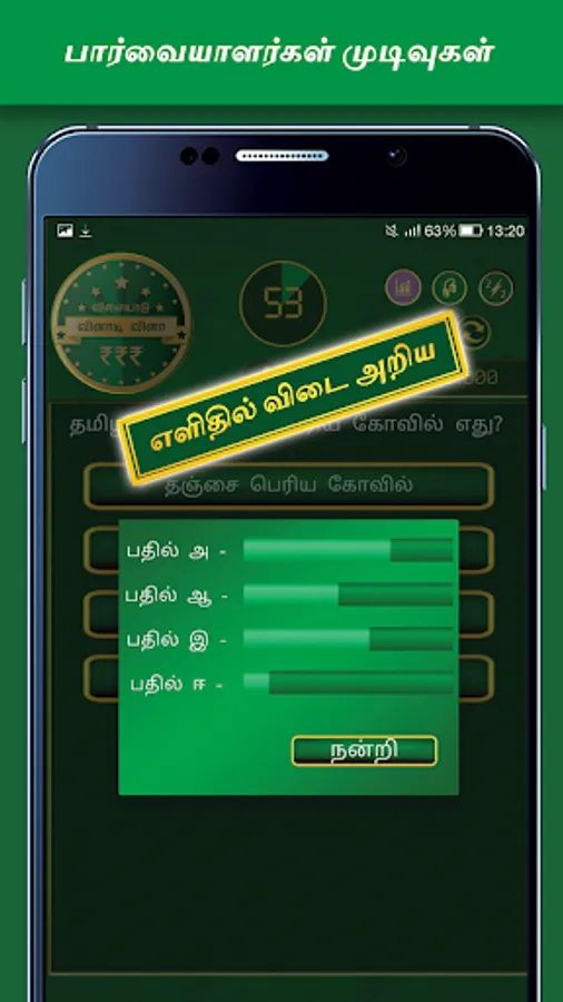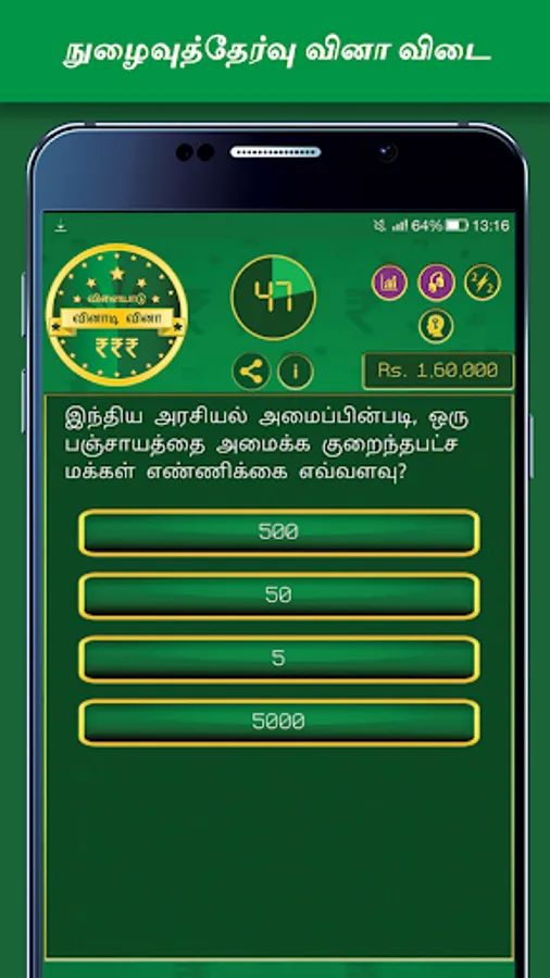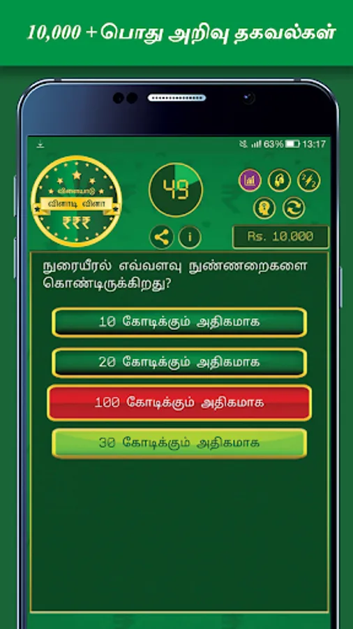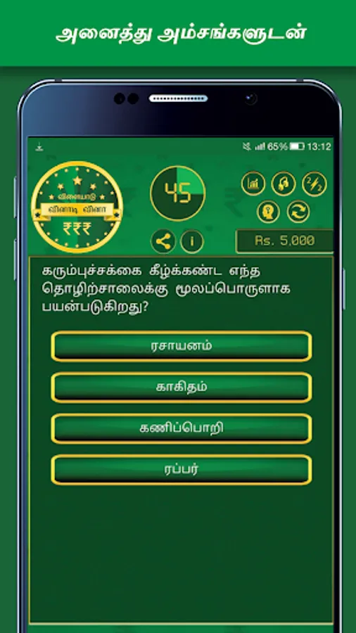 This is an android app I brought to every one of us to improve our general knowledge in Tamil language in a unique way. The app will present 12 questions in Tamil in each stage, as you answer correctly, you will progress to the next question. Your score will also increase, by the time you answer 12th question correctly, you would have scored 1 crore.