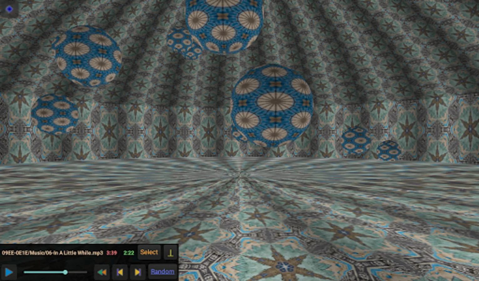 ** 3D Rooms - Exhibits patterns in 3D perspectives, covering the walls, ceilings and floors of various Rooms. The Rooms can be navigated via keyboard commands, or automated Roaming motion can be activated.