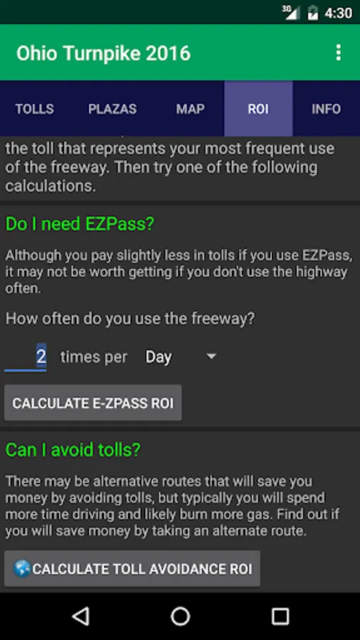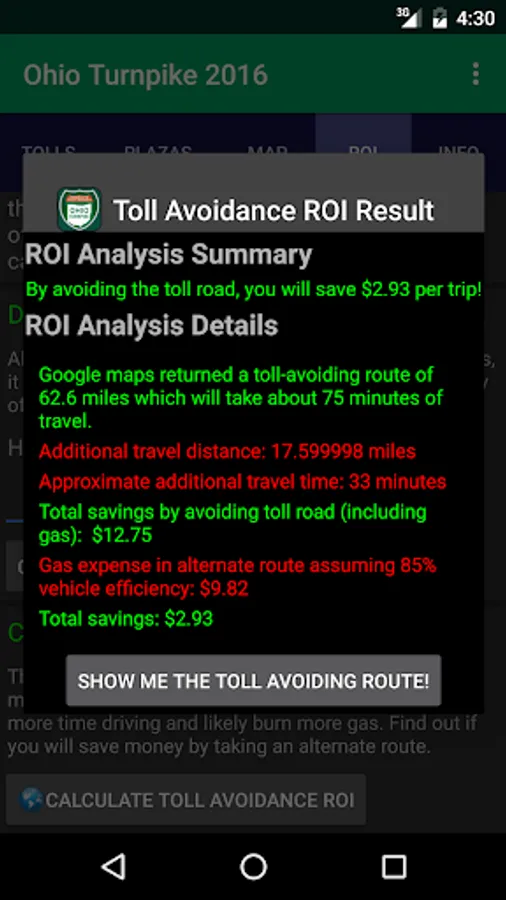 This app WILL SAVE YOU MONEY! Remember avoiding a toll road does not always save money because you may spend more on gas. This app will tell you exactly how much you will save by taking into account the extra distance you will travel. You will potentially save many times the price of this app in just one trip!