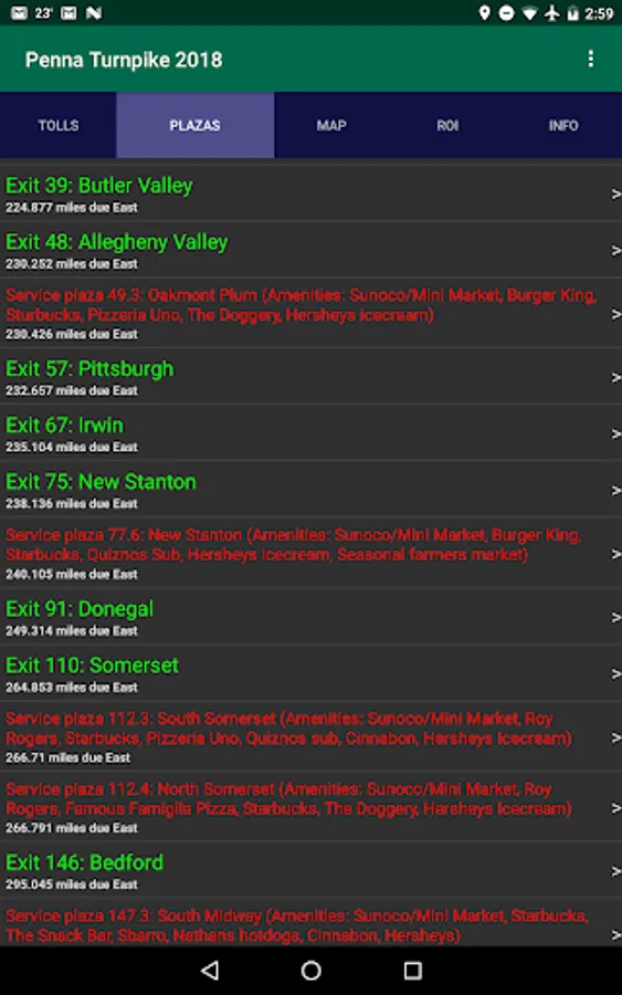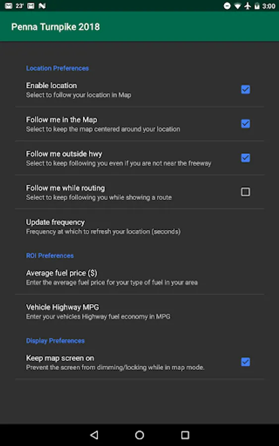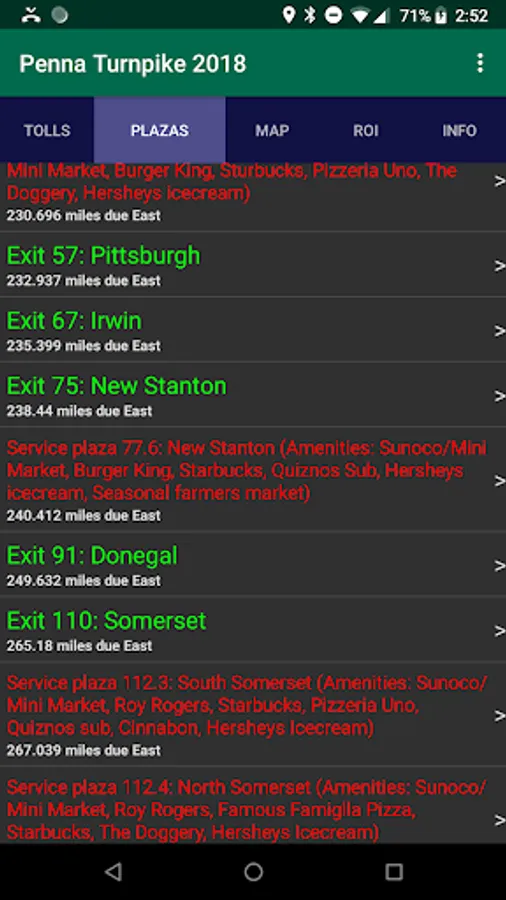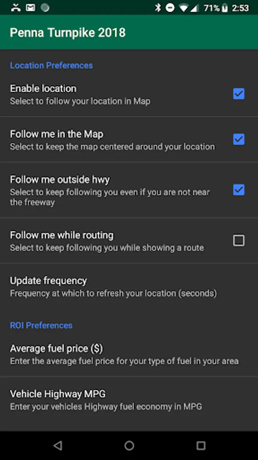 This version also uses the latest Google Pie API and the newest permission model, which means you will be asked for location permission the first time you use this app. Location is only used in the plaza and map tabs to calculate distance from toll plazas, service plazas, and exits, so If you deny the permission, these features will not work but the app will still continue to function. You can add the permission back to the app at any time by going to your Android settings.