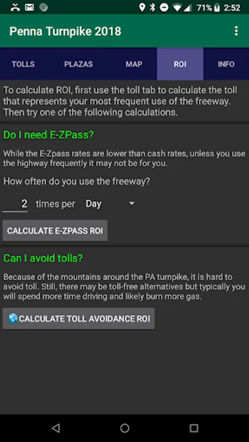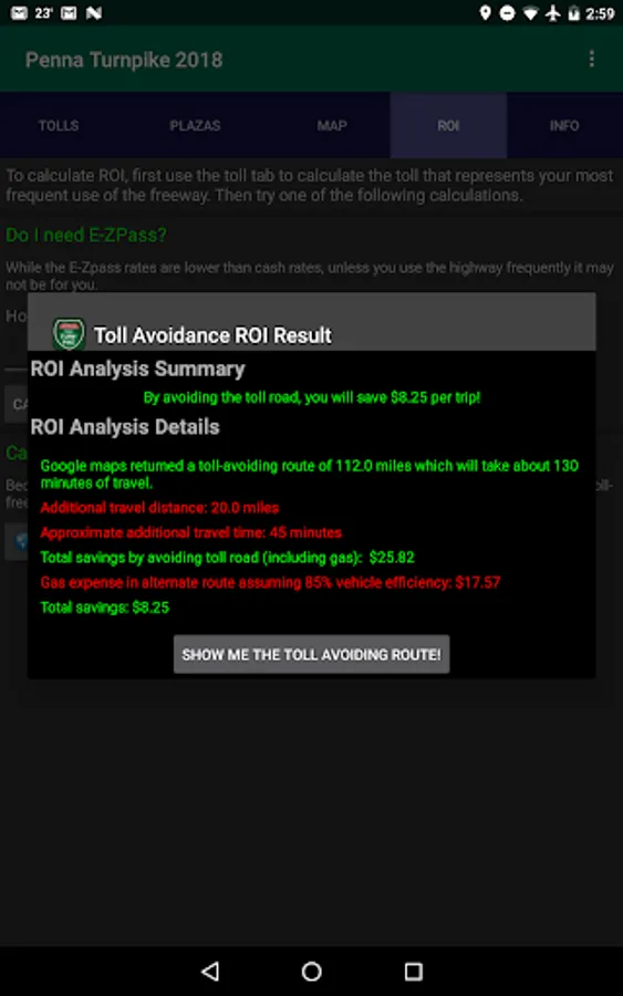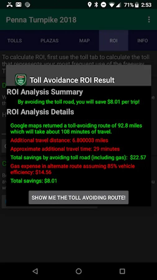 This app WILL SAVE YOU MONEY! Remember avoiding a toll road does not always save money because you may spend more on gas. This app will tell you exactly how much you will save by taking into account the extra distance you will travel. You will potentially save many times the price of this app in just one trip!