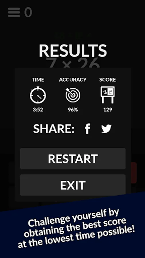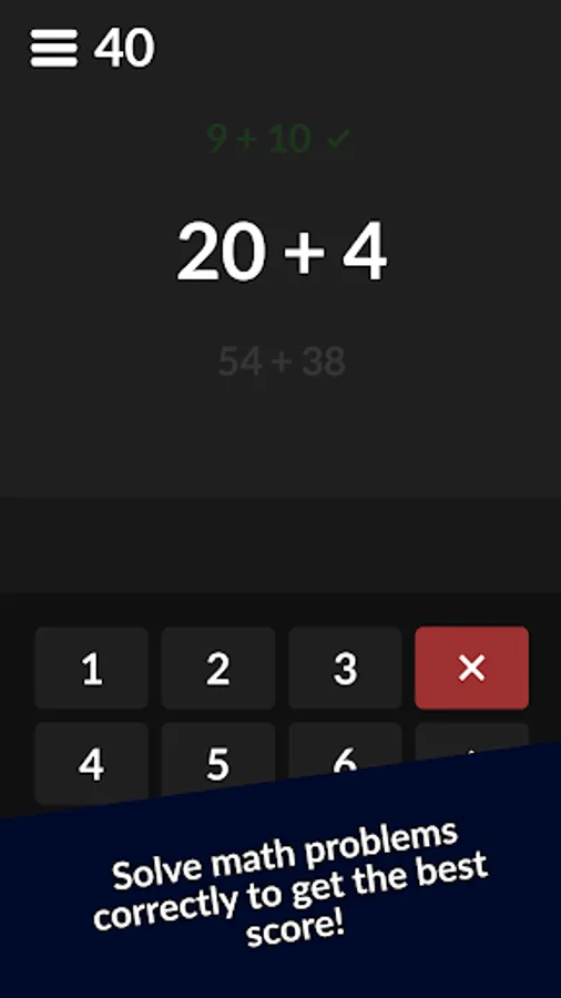 A standard game will generate 50 questions for you to solve. Solving questions correctly will increase the difficulty of the game and generate harder questions, while incorrect answers lower the difficulty. Correct answers will automatically be accepted by the game, while incorrect answers (if the question is too difficult) will be accepted after a short delay. After all 50 questions have been answered, you will be presented with your score.