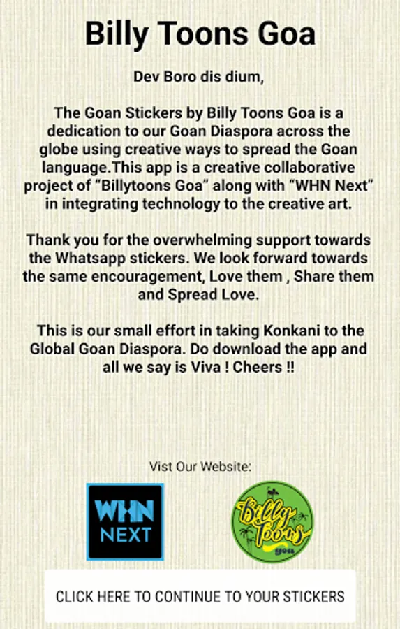 Billytoons in Collaboration with WHN Next Thank you for the overwhelming support towards the Konkani Whatsapp Stickers. These Goan Stickers by Billytoons is a creative way of connecting our Goan Diaspora through Konkani words. “Goan Stickers by Billy Toons” is dedicated to our Goan Diaspora to spread their own language “Konkani” across the world. Moreover, These Goan Stickers express Love between the Goans for various occasions like feasts, football tournaments, rains, and many more.