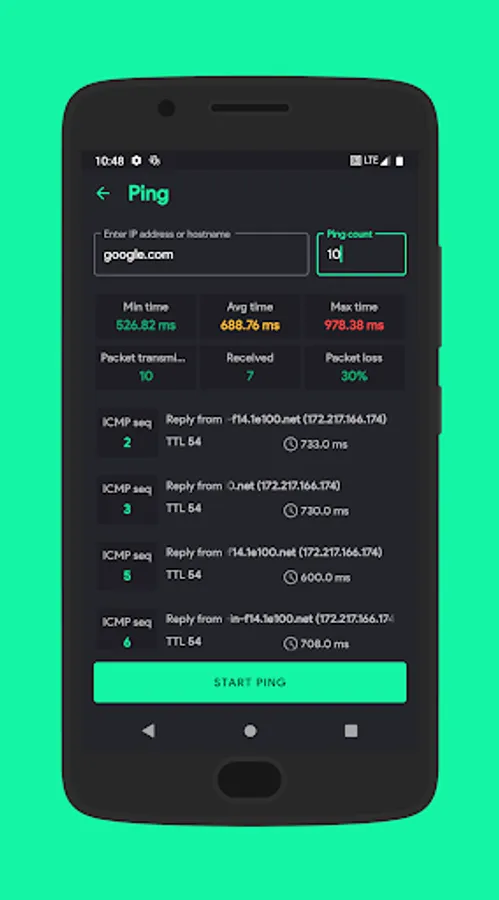 This application additionally provide ping feature, scanning open ports and knowing your public IP address.