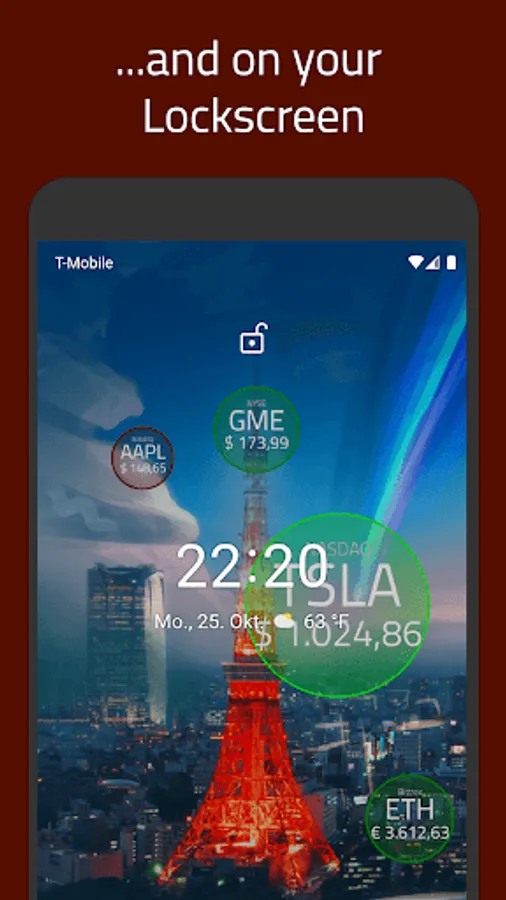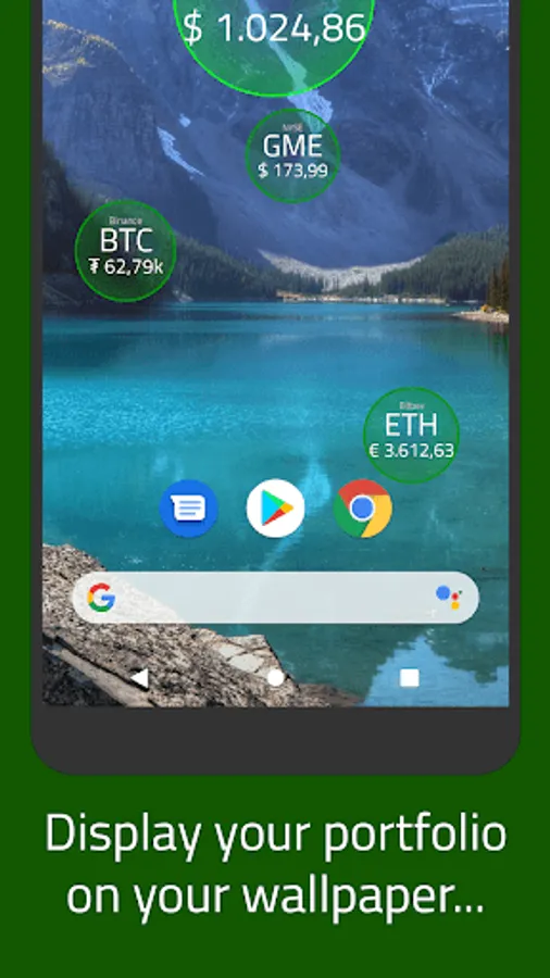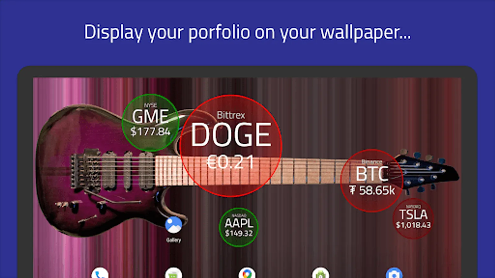 • Display your stocks (AAPL, TSLA, ...) and cryptocurrency (Bitcoin, Ethereum, ...) portfolio in form of moving bubbles on your phone's wallpaper.
