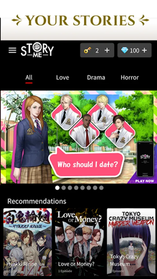 The story endings are up to your choices. You are the creator of your own ending! Select episodes from a wide range of categories, including romance, suspense and detective are available.