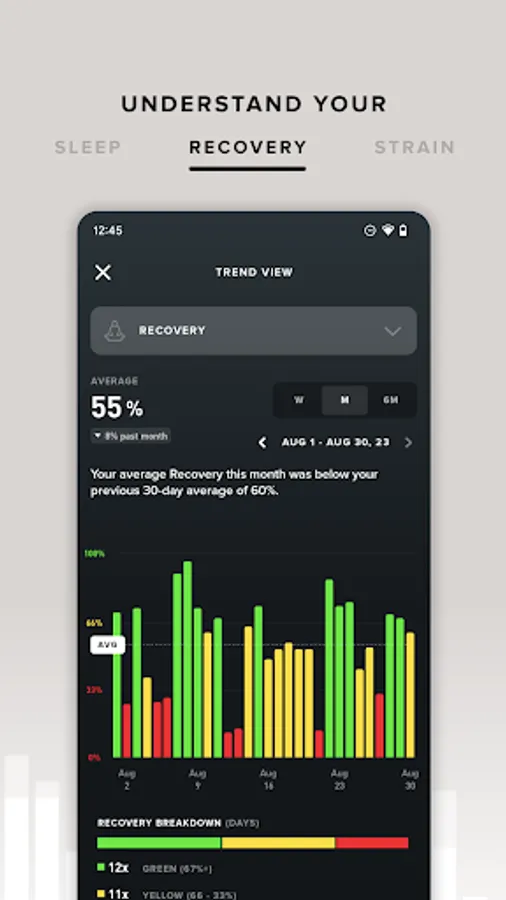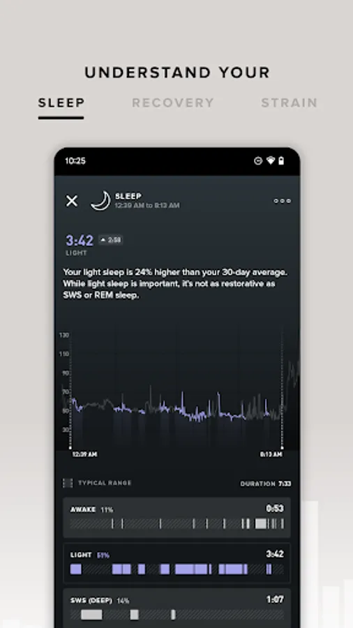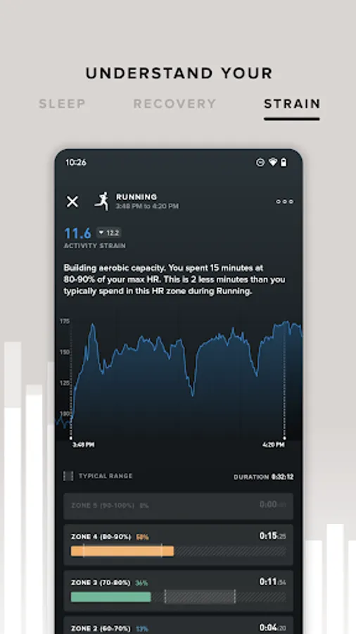 • Dig into the details: See a breakdown of your activities by heart rate zone, and even see trends across Sleep, Strain, and Recovery up to 6 months at a time to adjust your behaviors, training, plans and more