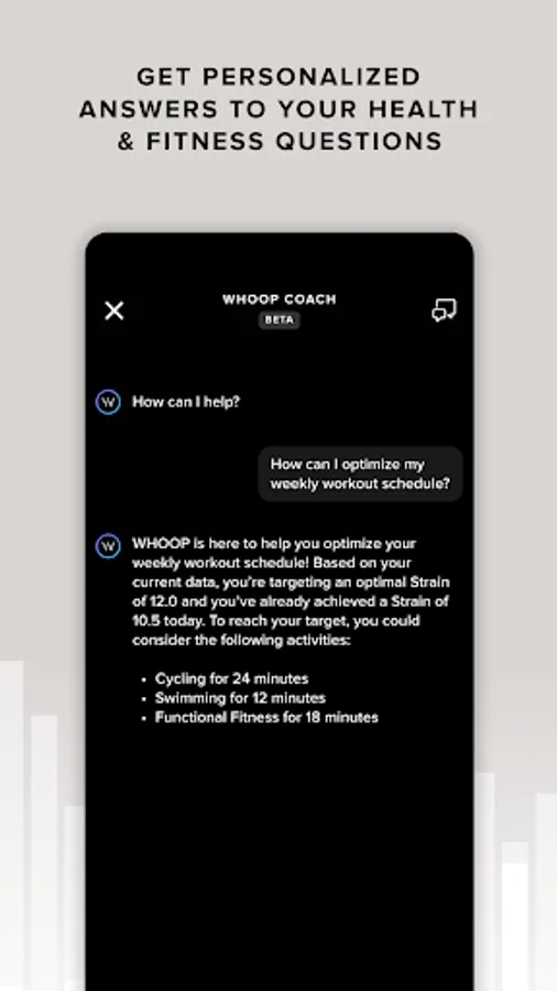 WHOOP Coach: Ask questions about your health & fitness and get highly personalized, specific-to-you answers on demand. Using your unique biometric data, the latest in performance science, and OpenAI's technology, WHOOP Coach generates responses on everything from training plans to why you’re feeling tired.