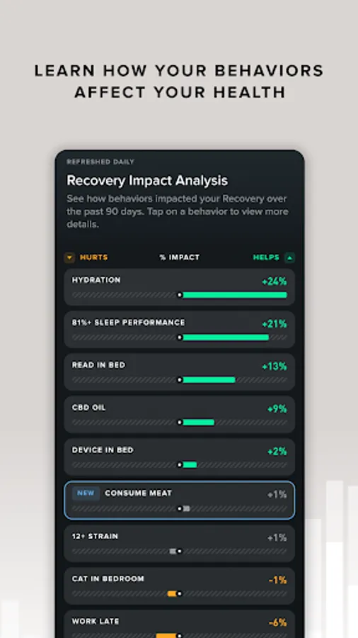 Behaviors: Track the impact of over 140 daily habits and behaviors, like alcohol intake, medication, stress, and more, to better understand how these various behaviors help or hurt you.