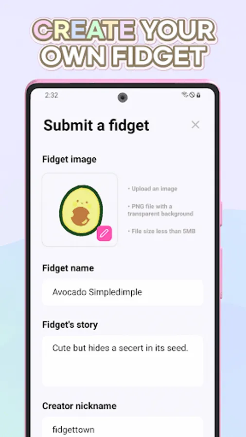 Fidget Town is a home for all kind of fidgets. Create your imaginary fidget and submit it! Selected fidgets will be later added after review. Your fidget can be a rare fidget that everyone wants to own!