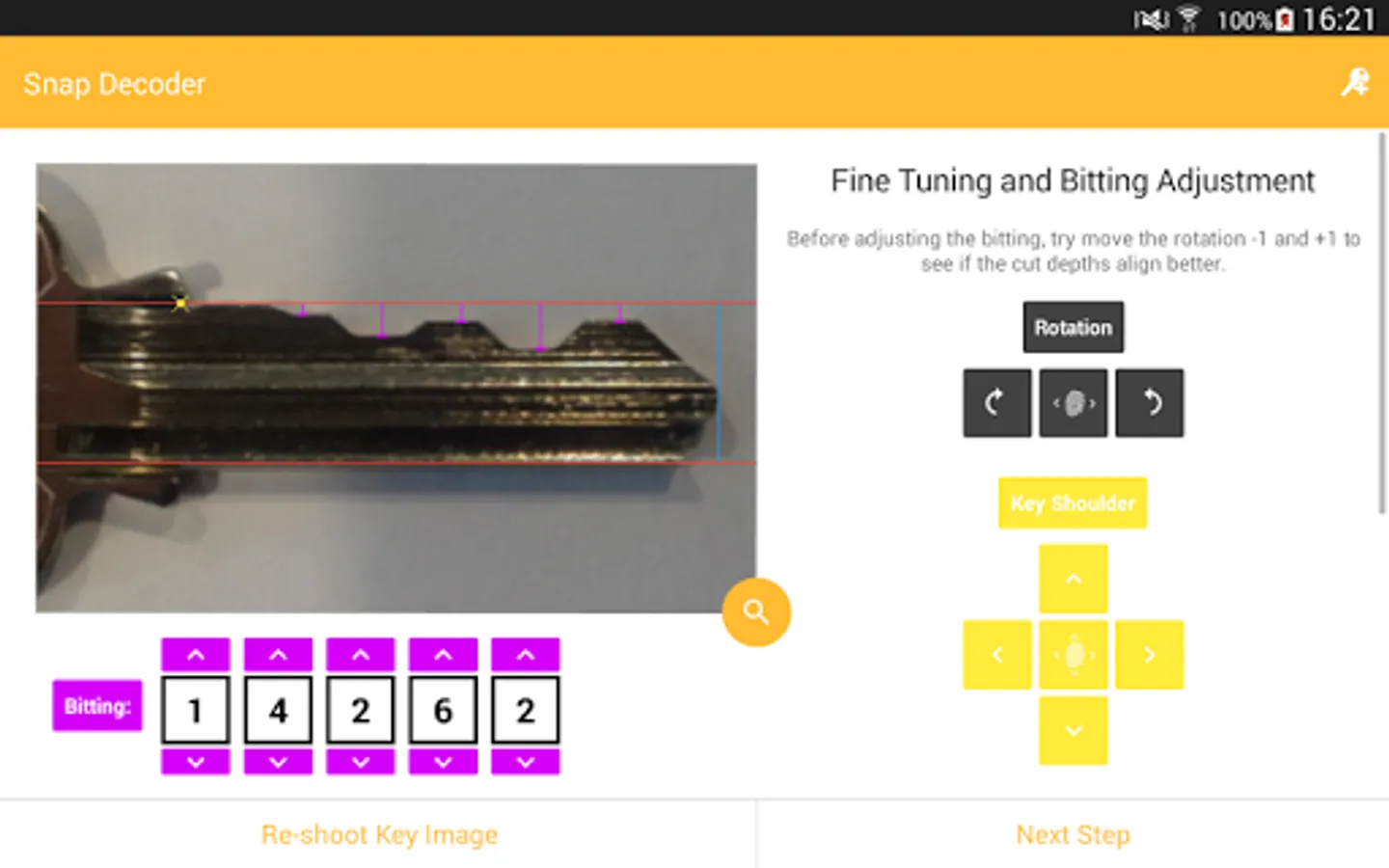 Snap Decoder is programmed with proprietary key edge detection algorithms. If your photo is on a plain, white background and in focus, the app will detect all the features of the key and calculate the bitting in seconds.