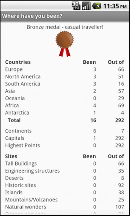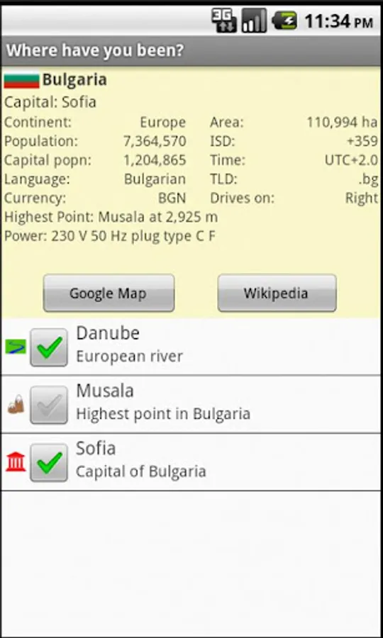 This application provides brief information for 292 countries, territories and islands (all the countries of the world). This includes capital, population, area, language, currency, time zone, dialing code and electricity details. It also includes over 550 sites that you may visit (13 categories - buildings, deserts, oceans, wonders of the world, US states, etc).