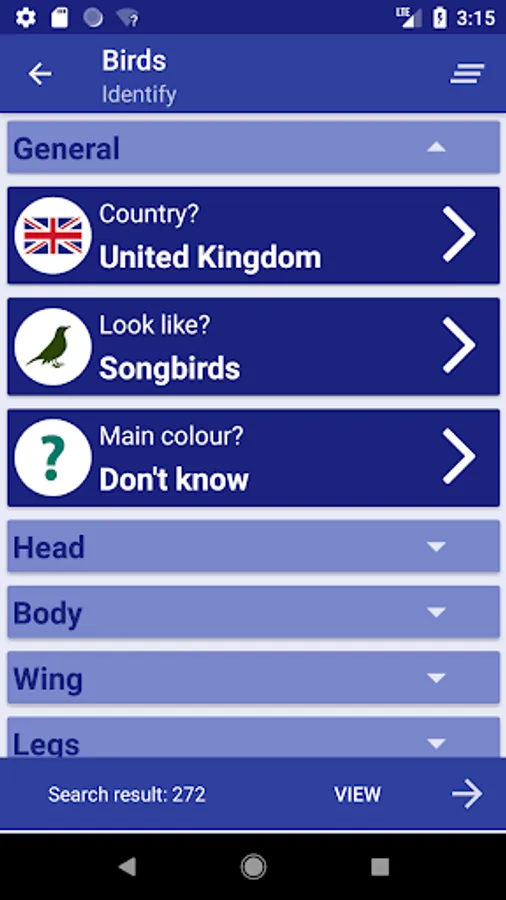 Search criteria include color and shape of head, legs, body, wing and tail.