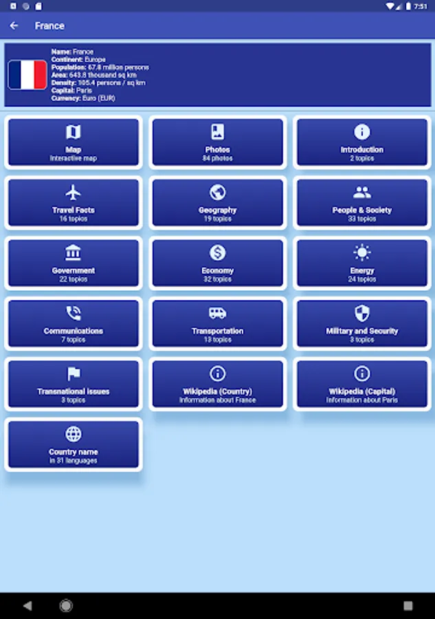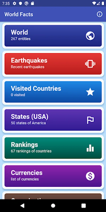 The "World Facts"-application contains information and facts organised in specific (colorised) categories to allow fast and easy access to specific details.