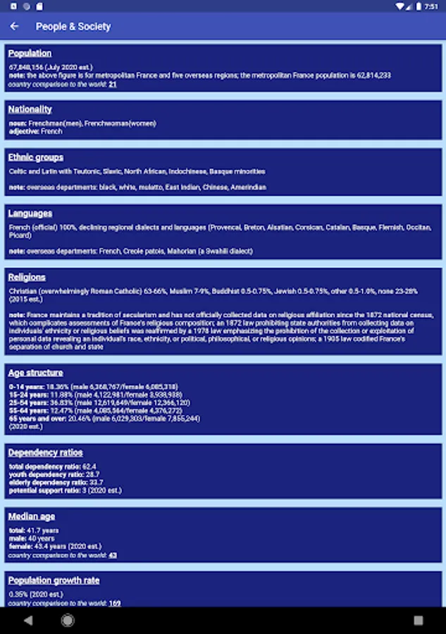 This is an application, based on recent (June) 2020 data from a.o. the popular CIA WORLD FACTBOOK, US Census bureau, etc..