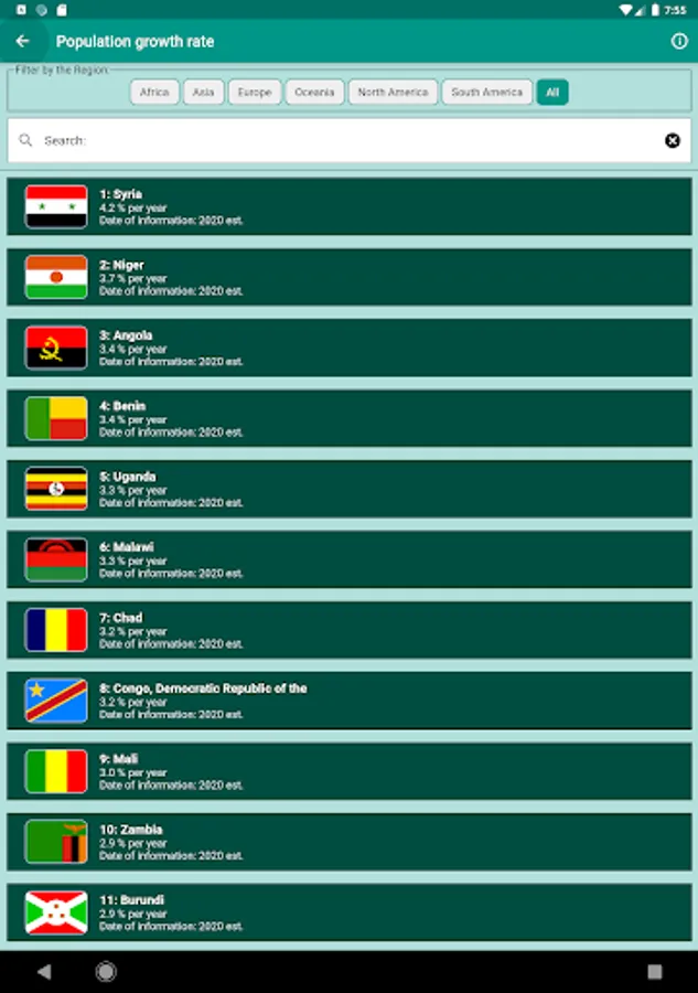 Rankings of countries is included for 60+ different topics, ranging from population size to size of the country. Optionally, ranking can be listed per region.