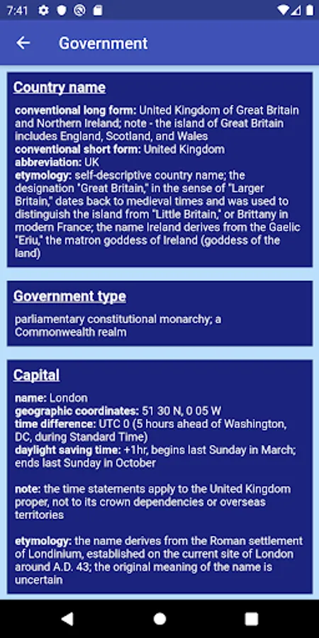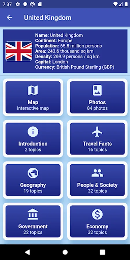 It provides educational facts and figures presented in text and nice charts. A handy application when traveling, doing research, education, or when watching sport events like the olympic games, etc.