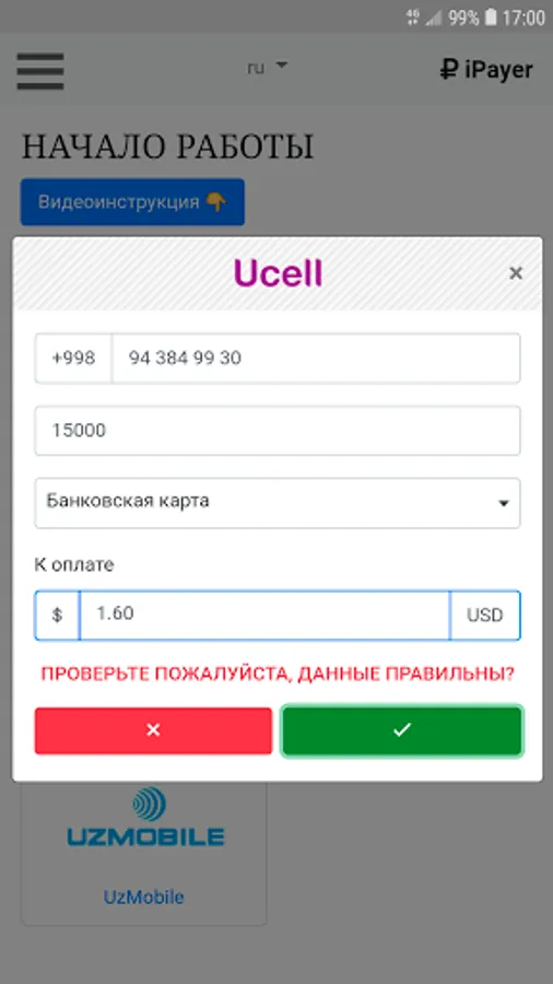 * Pay for mobile communications, Internet, IPTV, etc. Uzbekistan