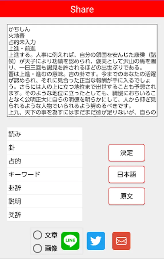 It is possible to share the results of a fortune-telling via email · LINE · Twitter.