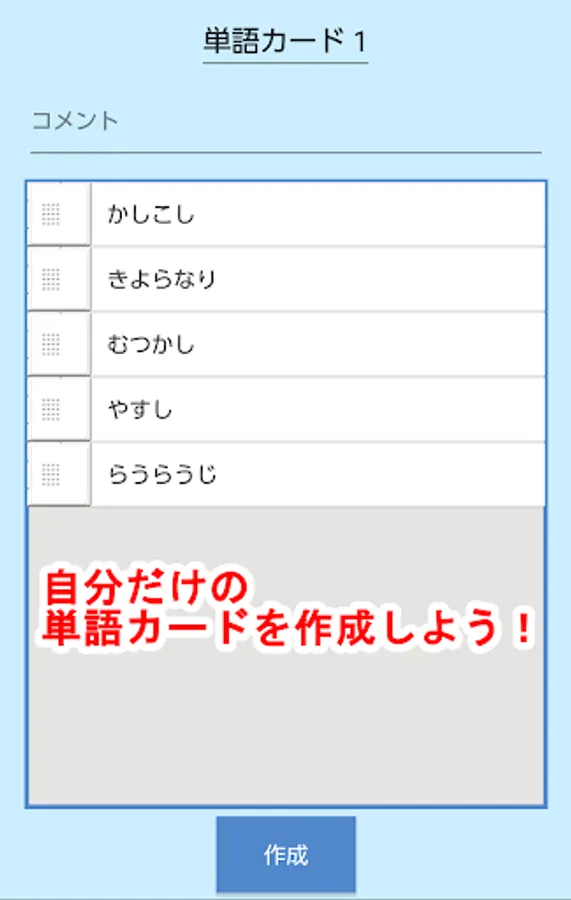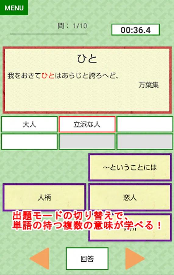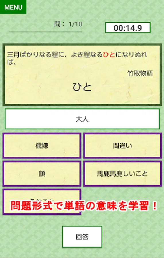 Pocket Classical Word Book "Pokotan" is an app that allows you to learn ancient Japanese words in the form of questions.
