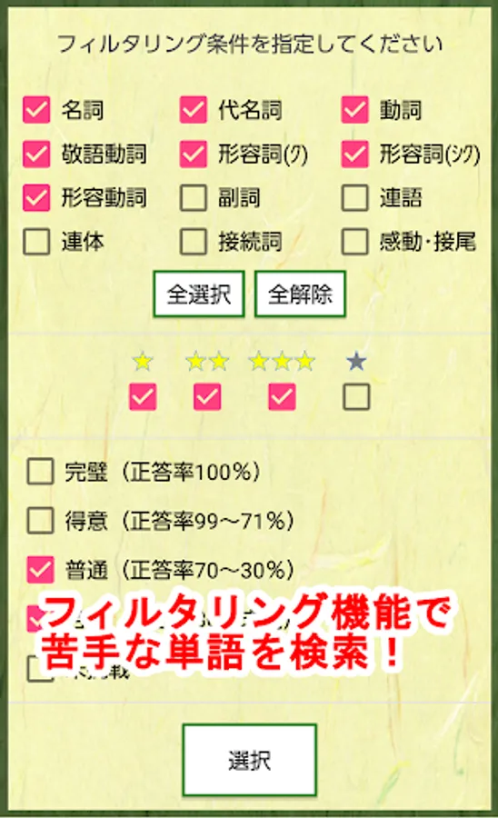 You can extract words based on various conditions, such as parts of speech and words that you are not good at.
