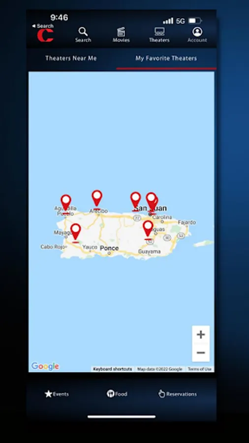 Theaters: links with Google Maps to show you the closest theaters. You can also keep track of your favorite locations.