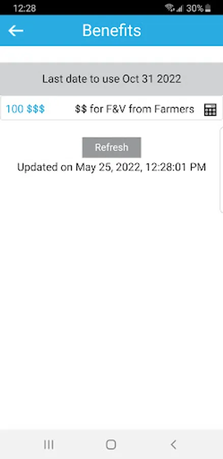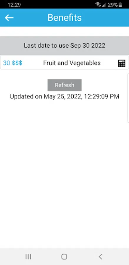 Benefits displays the available quantity and description of the current and future household benefits. The calculator for Fruits and Vegetables helps calculate the cost of fruits and vegetables.