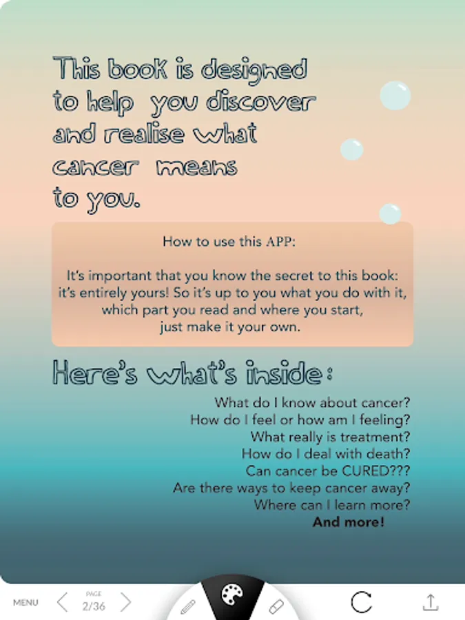 A Little APP About Cancer is designed to help elementary aged children who are experiencing cancer – through a parent, grandparent or other family member – deal with the hard times. Cancer can be confusing and scary for children. This app is a tool adults and children can use to open dialogue about the difficult topics of cancer in an interactive and creative way. The app doesn’t set out to act as a guide to explain the disease but it includes 30+ pages of age-appropriate, colourful interactive exercises and allows kids to ‘let it all out’ and work through what cancer means to them.