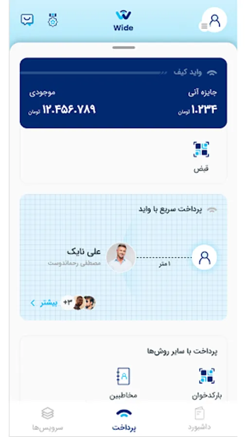 Wide, as the first hyper application and comprehensive bank payment solution in Iran, is proud to present the most diverse services with security and high speed to its users in a very simple way.