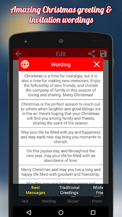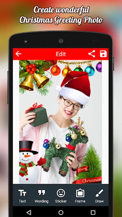 This is awesome way to say ‘Marry Christmas’. This “Christmas Cards And Frames” free Greeting Cards Maker offers you Christmas Cards, Greeting Quotes, frames, trees, bells, Santa’s cap n beard, ‘Wish You Merray Christmas & Happy New Year’ badges & various categories of stickers also you can draw Christmas patterns and colors over on yours picture.