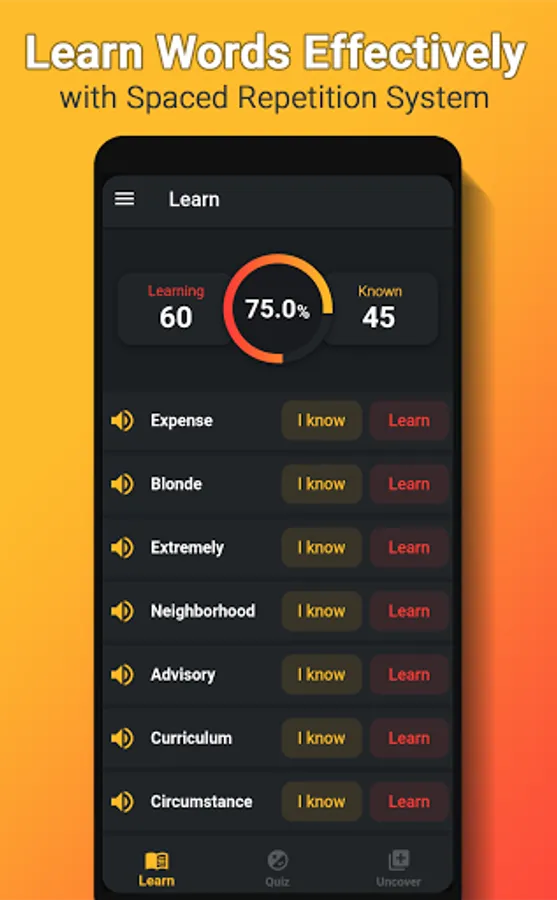 3 - Open the app daily, if you know a word click "I know" if not click "Learn".