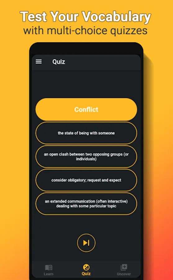 With the scientifically proven method of spaced repetition, you will never forget a word, when you click "I know" or "Learn" the system determines the optimal interval to repeat a word, easy words will be repeated after a long time, and difficult words after a short time.