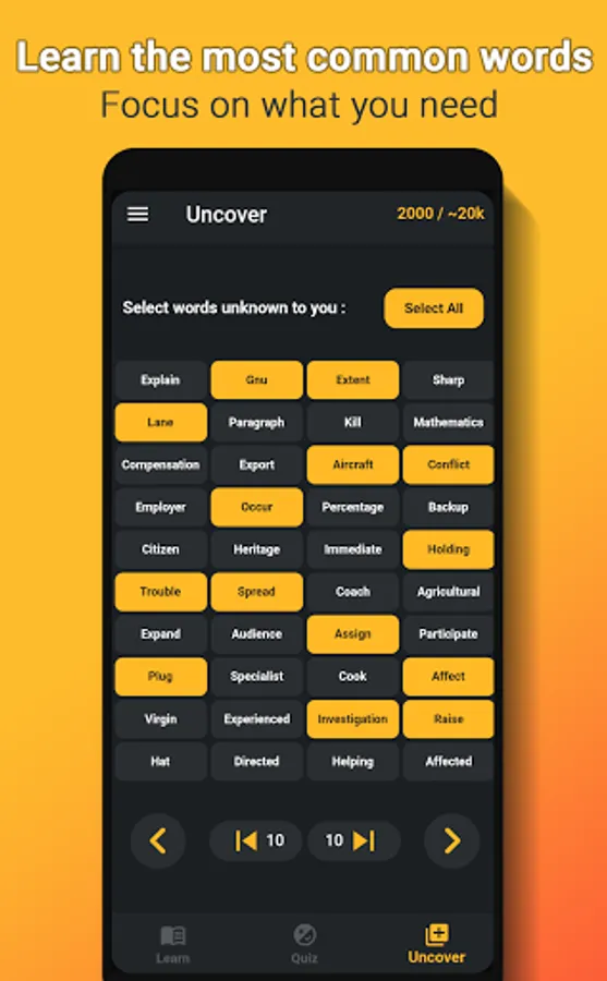 You don't need to master the entire dictionary to understand everyday English, According to scientific studies, 5000 words allow you to understand about 98% of most ordinary texts, 10000 words allow you to understand about 99% of most texts, In this app, we give you a generous number: 20000 most common English words, ordered by importance.