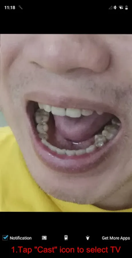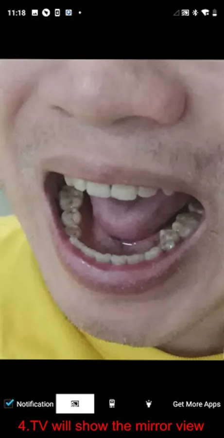 The Dental Mirror app can cast the camera's image to TV by Miracast, You can hold your mobile in the hand and see you mouth in big screen TV.