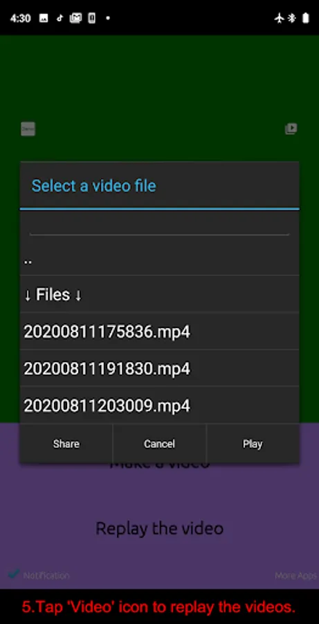 * Finally, Tap 'Video' icon to replay or share the videos.