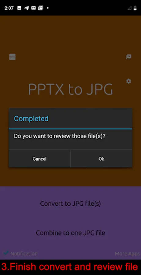 * Tap "Convert to JPG file(s)" and select a PPTX file.