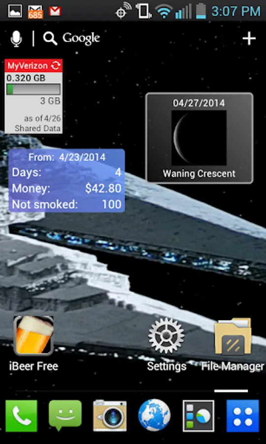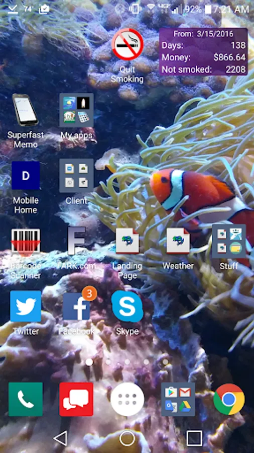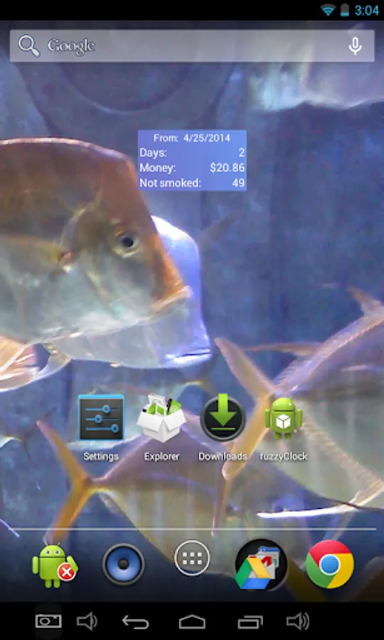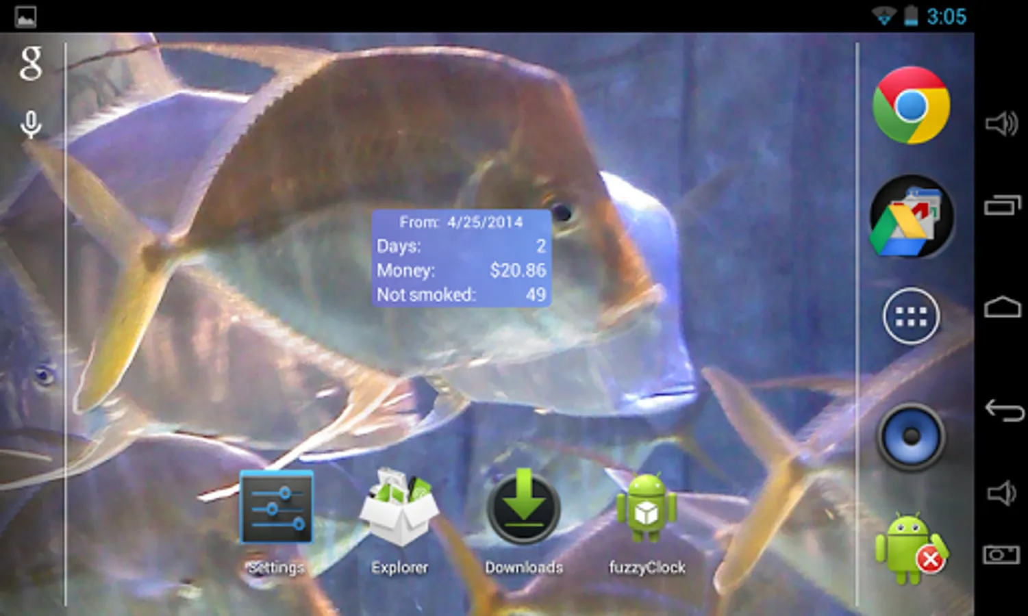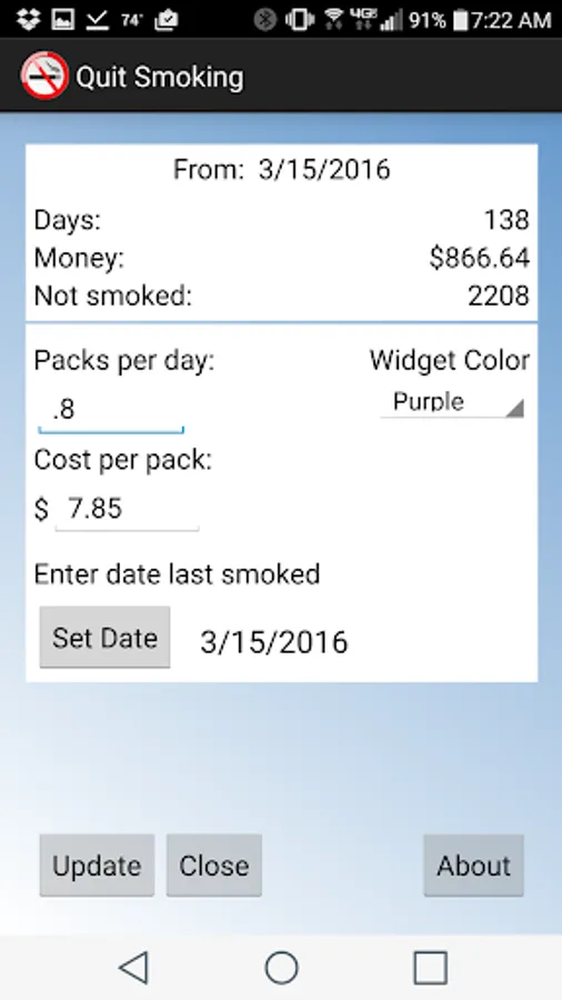 A widget to track money saved by not smoking cigarettes. Set your preferences for last date you bought cigarettes, how much you pay, and how many packs per day. You will be shocked how quickly the money adds up.