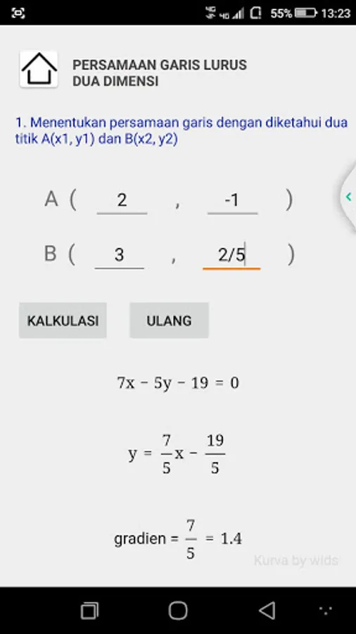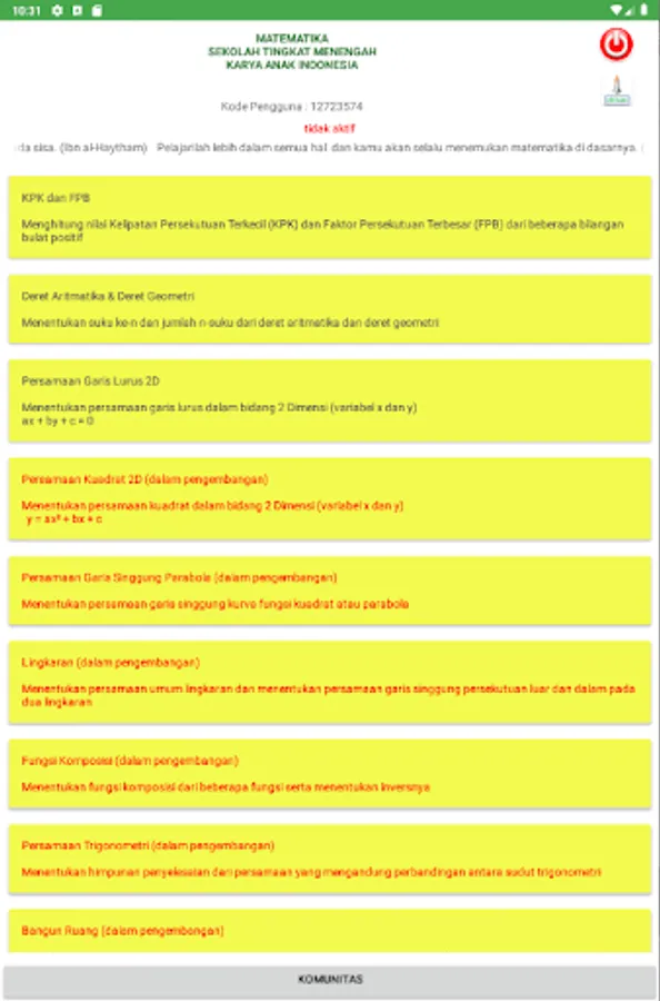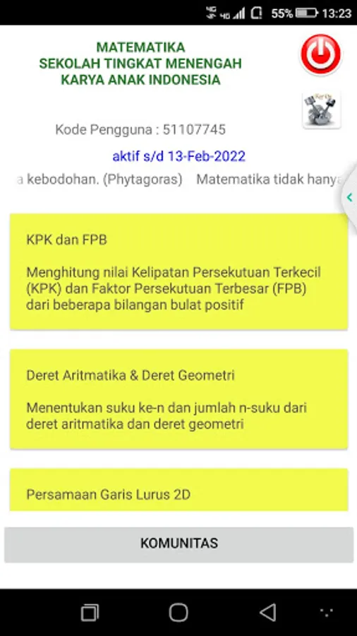 Applications that help find solutions for several materials at the high school level, such as KPK, FPB, arithmetic series, geometric series, straight line equations, and so on. This application is in Indonesian.