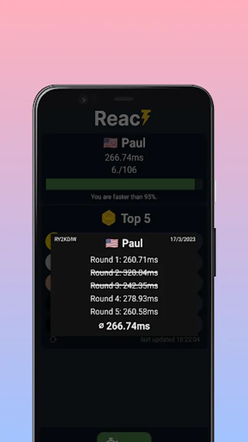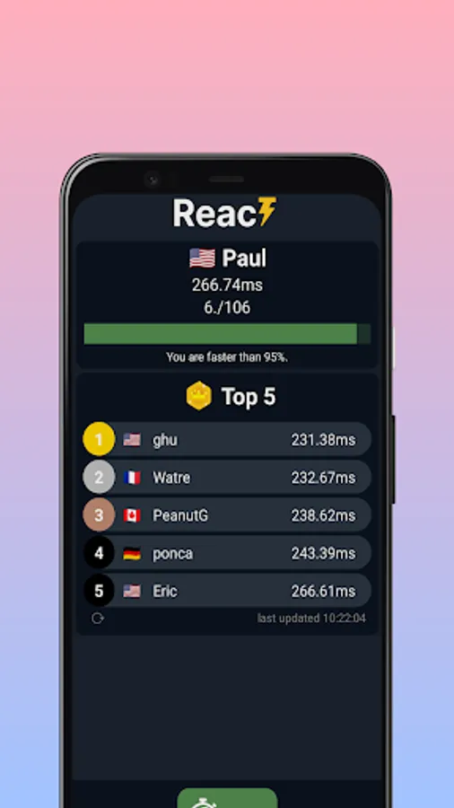 Your average reaction speed from five rounds will be entered into a leaderboard. Test your skills, compete with others and improve your leaderboard position! Can you become the fastest reactor?