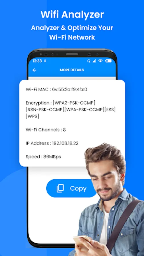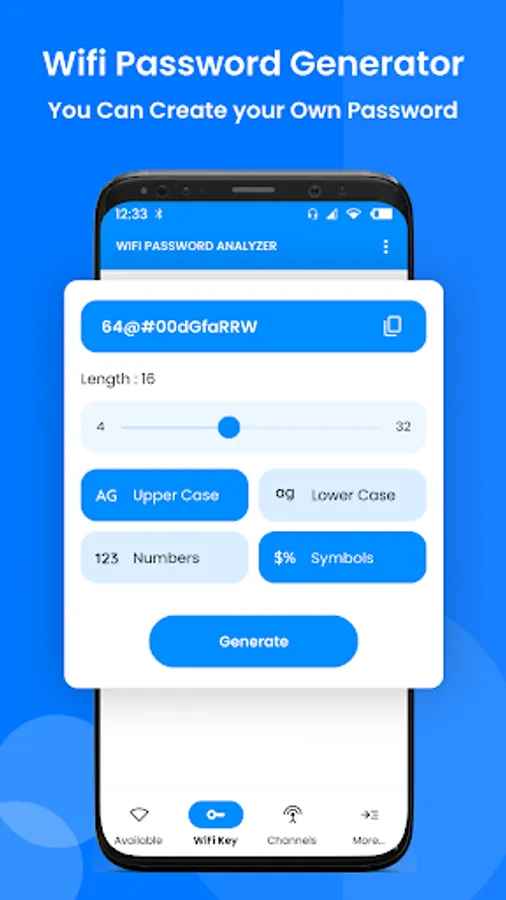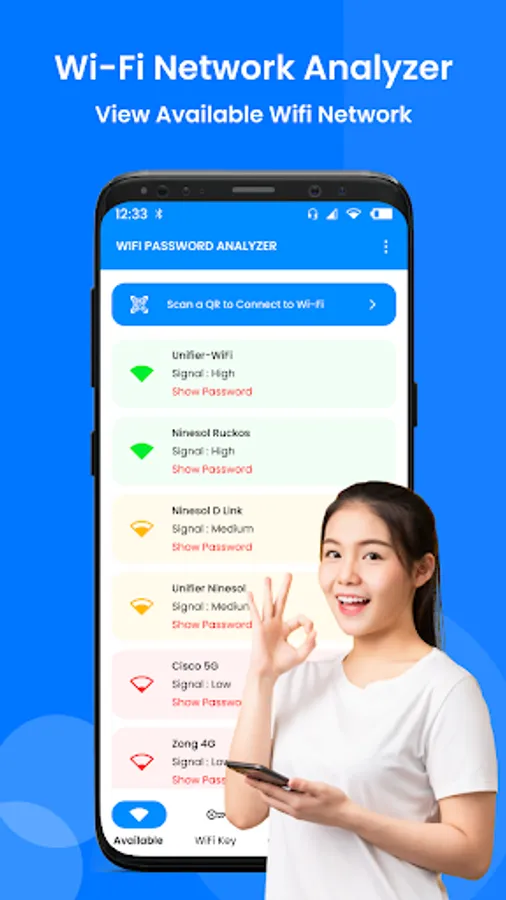 Wi-Fi Analyzer & Wifi Test App can increase the network performance through analyzing and monitoring your WiFi network! The wifi speed test and WiFi Monitor App will give useful information about WiFi signals around you which supports 2.4Ghz and 5Ghz. If you need to optimize your WiFi network by exploring nearby WiFi networks, measuring their signal strength as well as detecting crowded channels. Just open WiFi Analyzer & Wifi Password Generator app, it will support you!