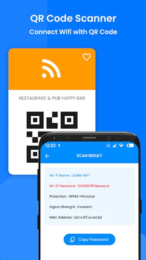 QR code generator - Wifi scanner permits you to connect easily to a Wifi network by scanning a QR code. You don't need to enter a password to connect with a wifi network, if you have Wifi QR generator feature. Open the WiFi QR Code generator feature & scan the QR code of the wifi which you need to connect.