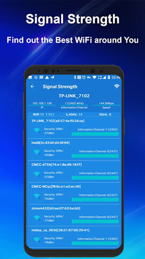 View your current WiFi connection signal strength and detect WiFi Signal Strength around you in real time. Quickly check your WiFi strength to help you find the best location.
