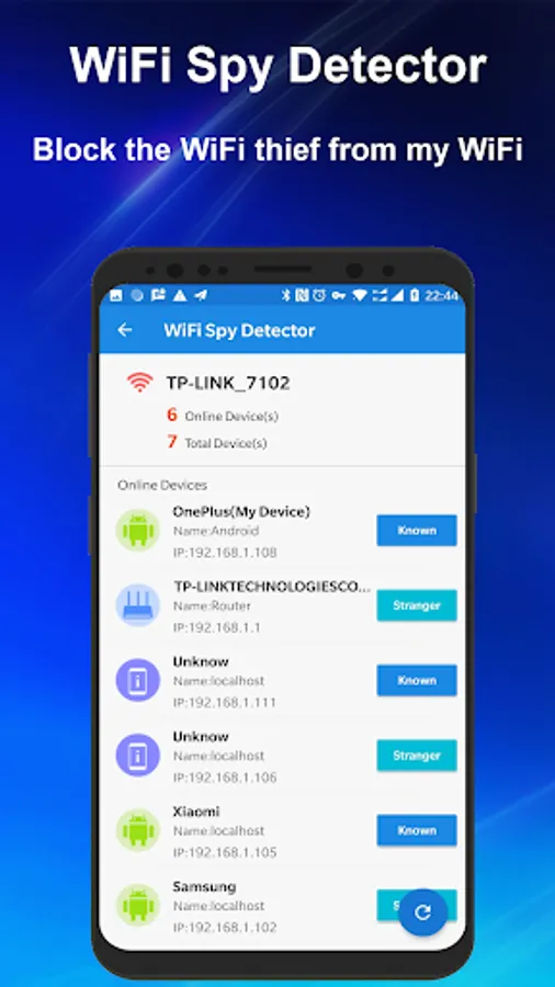 Easily scan my WiFi and see how many devices connected to your WiFi network. You can mark as 'Known' or 'Stranger' or block them from your WiFi Router.