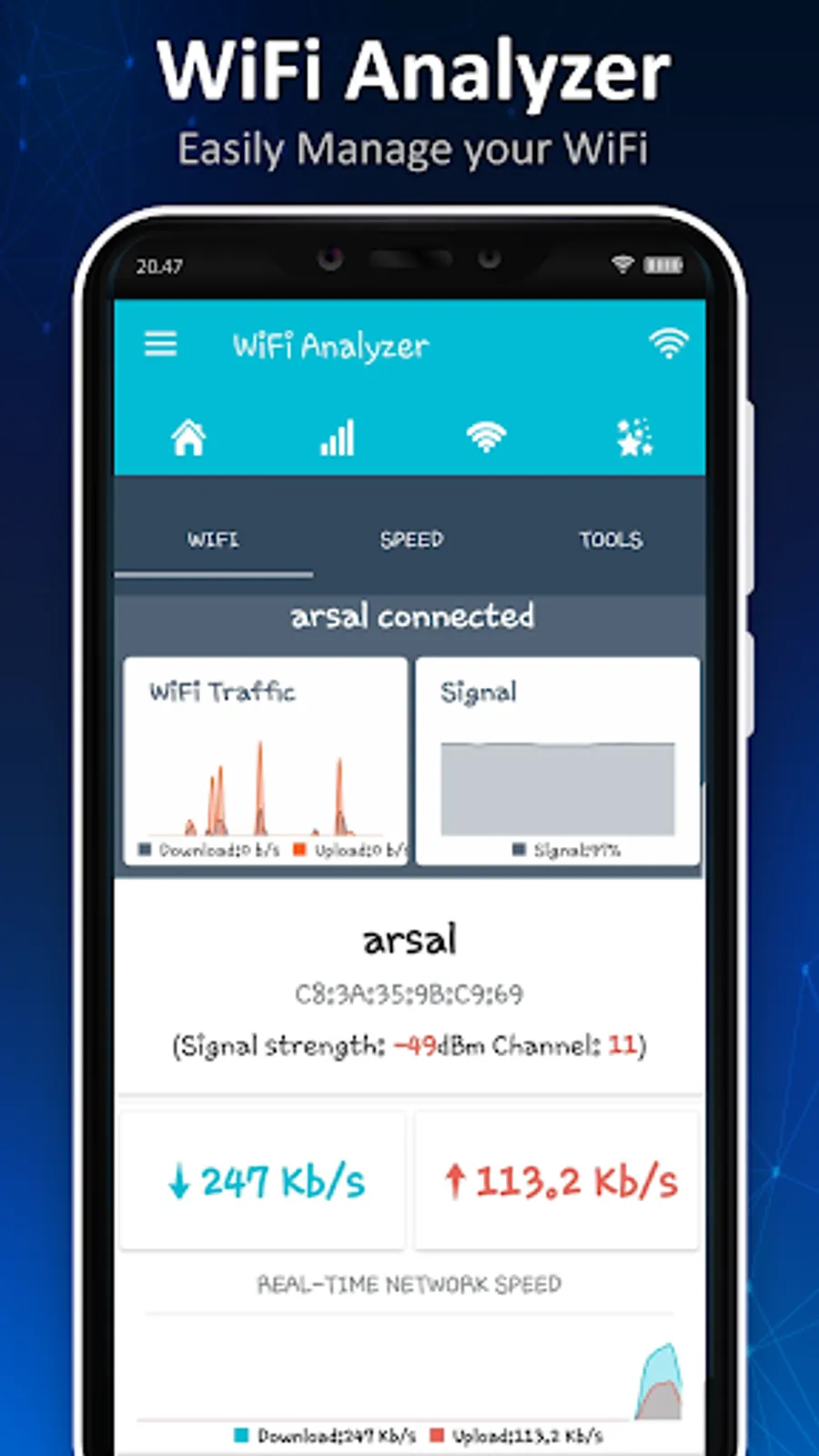 You can check the wifi speed of your router through this wifi speed tester app. Wifi key master has this additional feature that can help you to get the actual uploading and downloading speed of your internet wifi connection. It can help you to check the speed so you can check is your connection stable and speedy or is it slow connection so you can stable it to get a strong wireless connection.