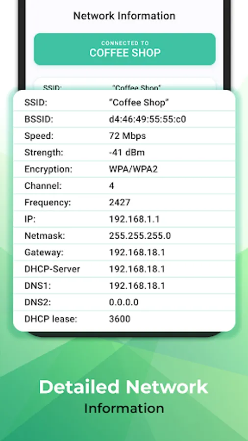 6. The connected Wi-Fi detail feature of Wi-Fi key recovery lets the user get information regarding their network connection. Using this feature, the user can determine SSID, BSSID, speed, strength, channel, frequency, IP, DHCP lease, etc.