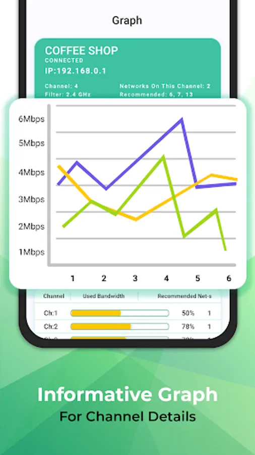 4. The graph feature of Wi-Fi key finder authorizes the user to determine the graphical representation of channels, bandwidth, and recommended channels. Using this feature, users can easily identify the recommended channel for a better internet connection.