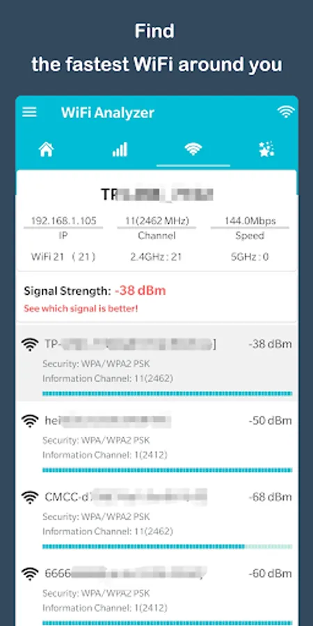 The app can increase the network performance via analyzing and monitoring your WiFi network! The WiFi Analyzer and WiFi Test app will provide useful information about WiFi signals around you witch supports 2.4Ghz and 5Ghz.